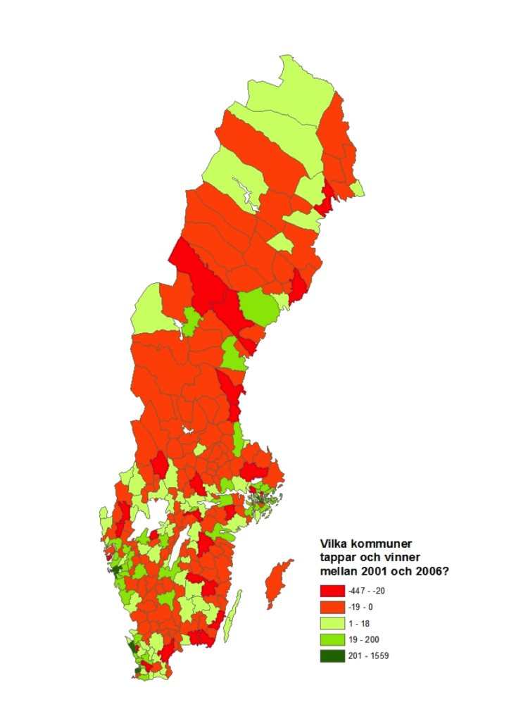 Men om till en början nu fokuserar på perioden då de unga vuxna med högre utbildning flyttar direkt efter sin examen. Vart bor de fem år efter avslutad utbildning? Det är en tidpunkt då man kan anta att det finns ett relativt stort fokus på att starta sin karriär. Jag koncentrerar mig alltså enbart på flyttar som just dessa 99 000 individer har gjort. Kartan nedan visar alla Sveriges kommuners nettomigration de första fem åren (antalet 2001 minus antalet 2006). D.v.s. vilka kommuner är nettomottagare (tar emot fler än de förlorar) och vilka är nettogivare (förlorar fler än de tar emot)? De röda kommunerna är de som förlorar mest och de gröna kommunerna är de kommuner där dessa 99 000 ungdomar istället väljer att bosätta sig i.