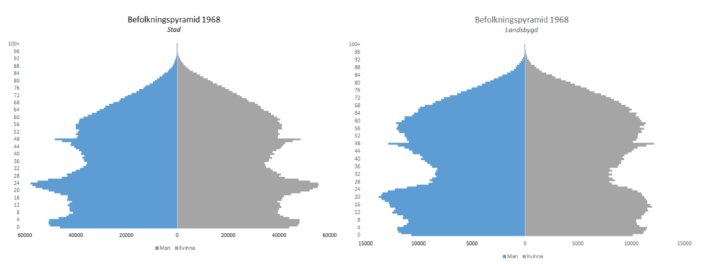 Figurerna nedan är sådana som brukar kallas för befolkningspyramider och som visar hur många personer det finns, män respektive kvinnor, i varje ålder. Nedan är befolkningspyramider för stad och landsbygd år 1968. Man kan tydligt se den stora kullen efterkrigsbarn som lite raljant har kallats för Jätteproppen Orvar och som 1968 var i sin tidiga arbetsföra ålder. Skillnaderna är dock inte särskilt stora mellan stad och landsbygd vid den här tidpunkten. De ser inte helt ut som en regelrätt pyramid men det finns en stor bas som kan försörja de äldre och barn.