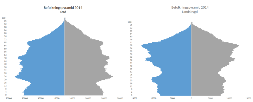 Om vi nu förflyttar oss nästan 50 år framåt i tiden från 1968 till år 2014 så har bilden ändrats dramatiskt. De befolkningspyramider som presenteras nedanför visar på ett övergripande men mycket tydligt sätt vad som är grunden till landsbygdens (och stadens!) utmaningar. År 2014 är skillnaderna mellan stad och landsbygd väldigt stora. Nu har stadens pyramid blivit ett torn med en stor utbuktande mage. Denna mage kan till stor del tillskrivas den flytt till städer som många unga vuxna gör vilket skapar en stor belastning på bostäder och infrastruktur.