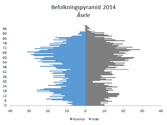 Vi kan avsluta med att titta på den kommun som mellan 2004 och 2014 hade den största befolkningsminskningen av alla Sveriges kommuner, nämligen Åsele. Denna lapplandskommun sjönk med nära 16 % och har en bas med arbetsför befolkning som är mycket liten i förhållande till den åldrande befolkningen. Utmaningen blir om möjligt ännu tydligare när vi ser detta ur en kommuns perspektiv.