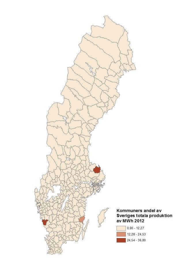 Sverige producerade omkring 152, 5 TWh el under 2016. Majoriteten kommer från kärnkraften och det högsta effektuttaget under hela året brukar ske runt lucia och det finns ju anledning att tro att dessa myslampor främst tänds i städer. Men om vi tittar på kartorna nedan är det landsbygden som till stor utsträckning producerar det. Den första kartan visar andelen av alla producerade MWh. Varberg, Östhammar och Oskarshamn producerar tillsammans nära 90 % av dessa (2012).