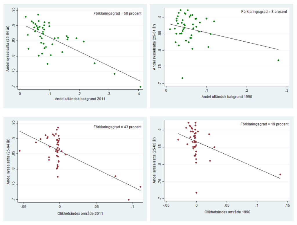 I mitt blogginlägg om Linköping hävdade jag att den ökade segregationen beror på att individer med utländsk bakgrund flyttar till områden med lägre socio-ekonomisk status, medan individer med inhemsk bakgrund flyttar därifrån. Dessa områden karaktäriseras ofta av hög andel hyresrätter, socialt utanförskap och hög arbetslöshet. Jag har i tidigare blogginlägg för Sverige som helhet visat på ett negativt samband mellan segregation och sysselsättningsgrad på områdesnivå, det vill säga att i områden som har ett högre värde på olikhetsindexet eller där det bor en högre andel med utrikes bakgrund är en mindre andel av befolkningen i arbete. Jag har även visat att detta samband blir starkare med tiden. Figurerna nedan visar att dessa två observationer även håller för de 45 områdena i Jönköpings arbetsmarknadsregion. Figurerna på vänster sida visar läget 2011 medan figurerna på höger sida illustrerar 1990 års värden.