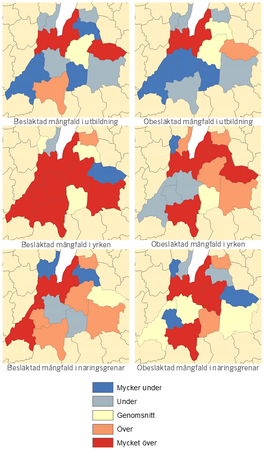 Genomsnittet i kartorna ovan syftar på genomsnittet för Sveriges alla kommuner, de kommuner som är gula tillhör därför den femtedel kommuner som ligger i mitten för hela landet avseende respektive mångfaldsmått. Röda kommuner har mer mångfald än dessa genomsnittskommuner medan blå kommuner har mindre mångfald. Kartorna visar att Jönköpings kommun ligger mycket över genomsnittet gällande alla mångfaldsmått, besläktade såväl som obesläktade. Detta är inte särskilt förvånande eftersom mångfald drivs av storlek, även om sambandet är långt ifrån perfekt. När det gäller utbildning är det förutom Jönköping endast Eksjö och Värnamo kommun som ligger över genomsnittet i besläktad mångfald.