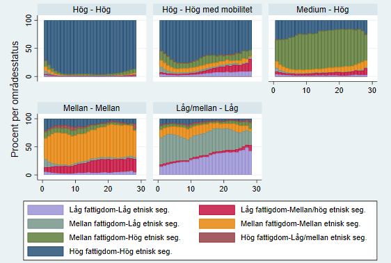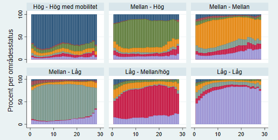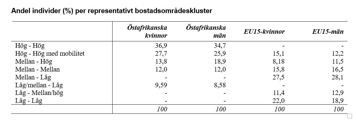 De flesta kluster domineras av en typ av område genom hela tidsperioden, vilket visar på låg grad av mobilitet mellan (olika typer av) bostadsområden. Från färgmönstren i diagrammen för respektive grupper samt från tabellen ovan syns en tydlig förskjutning av gruppen från Östafrika mot socioekonomisk svagare områden och en förskjutning av gruppen från EU15 mot socioekonomiskt starkare områden.