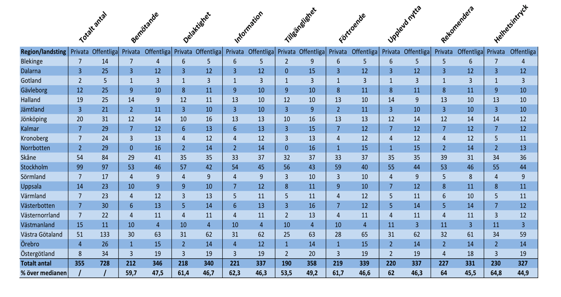 Alla värden över 50% visar att fler än hälften av de privata vårdcentralerna ligger på den övre halvan, och på samma kan man se värdena för de offentliga. I tabellen nedan går det att läsa ut resultat för respektive landsting/region och för riket som helhet inom vart och ett av de åtta frågeområdena.