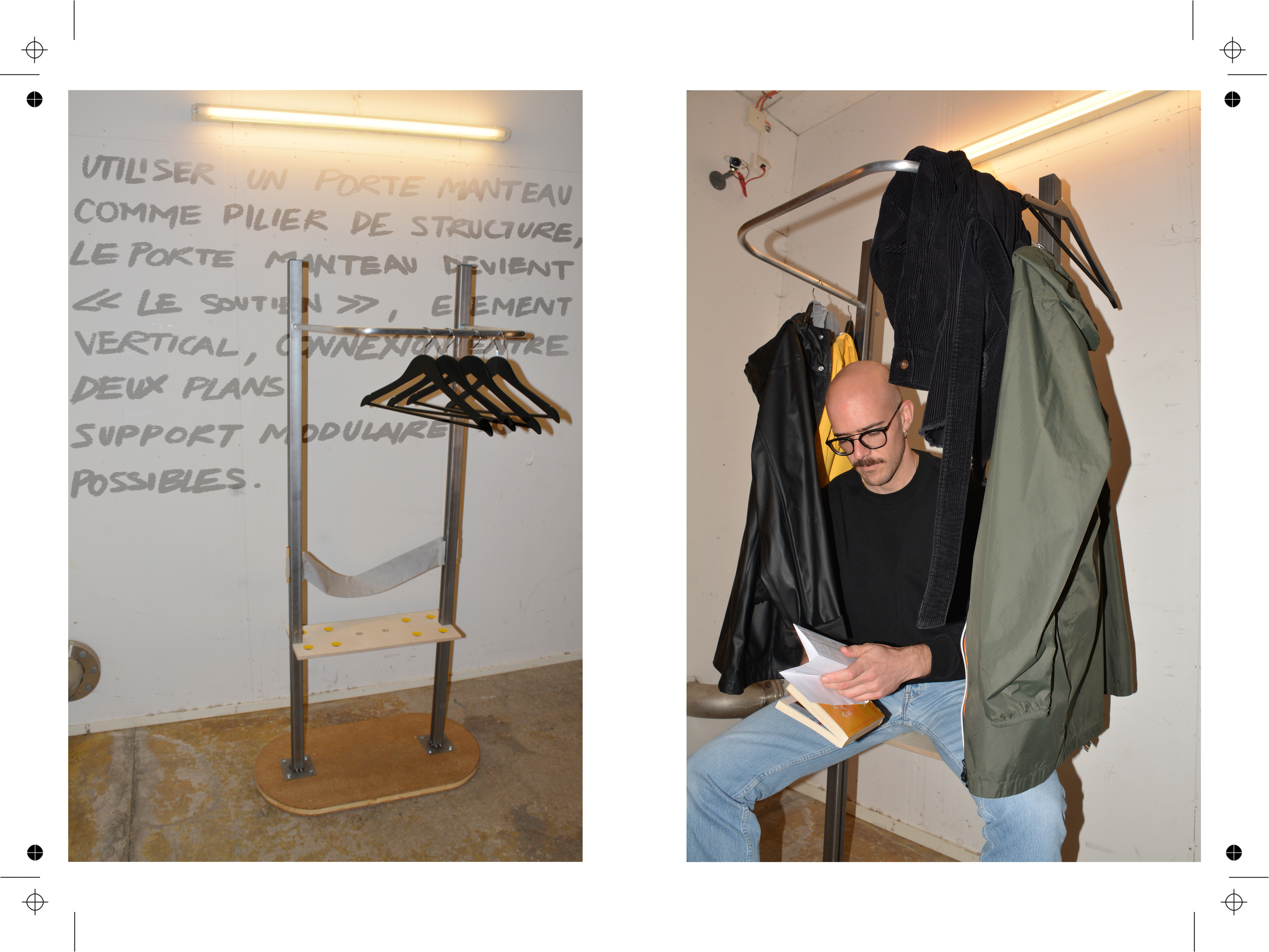 Home’s basic, the coat rack was selected to support this study as a concrete base for trend and consumer behavior analysis. From shared ornamental and functional object placed in the entrance of houses, the coat rack previously “hatstand”, is today an unnoticed domestic object. The final product was hand manufactured with recycled and raw component, allowing transparency on the production process and used material. Stacking up coats on the produced rack create a private space for the user to sit in, questioning the relationship between user and product (ownership, trust, value). Based on architectural concept and design theory, the product aims to bridge creative and technical disciplines to suggest a functional yet questionable product as dialogue starter.