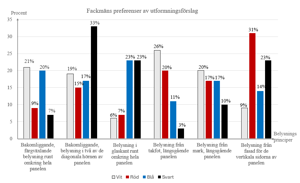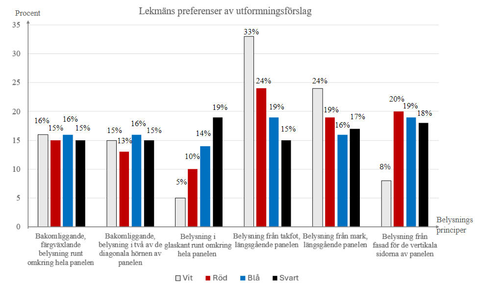I enkätundersökningen, med 350 respondenter, framgår det att lekmän och fackmän endast delar åsikter om vilken belysningsprincip som är mest tilltalande i kombination med vit fasadkulör. Båda undersökningsgrupperna föredrar takfotsbelysningen. För den röda, blå och svarta fasadkulören skiljer sig dock åsikterna åt.