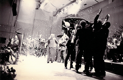 Konfetti singlar ner över scenen under invigningsceremonin för Stiftelsen Högskolan i Jönköping 1994.