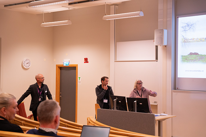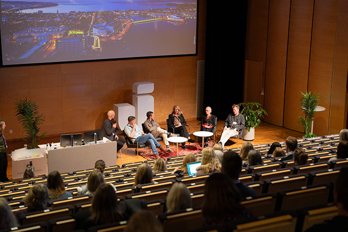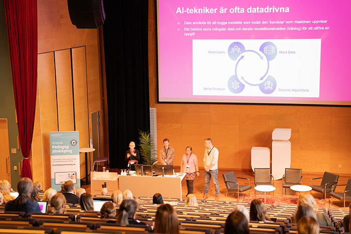 Lärande och kompetenser i förändring i en postdigital tid – AI i fokus var punkten på schemat efter fikat. Det var Ylva Lindberg, professor i pedagogik, inriktning språk- och litteraturdidaktik på HLK, Maria Bäcke, universitetslektor i litteraturvetenskap också HLK, Joel Rangsjö, verksamhetsutvecklare AI, utbildningsförvaltningen på Jönköpings kommun och Andrew Galbraith, förstelärare i AI, Erik Dahlbergsgymnasiet i Jönköping, som bland annat pratade om hur AI kan användas i utbildningssyfte.