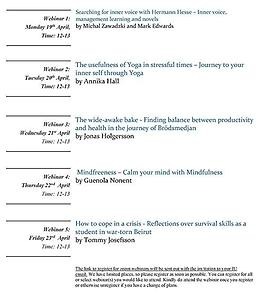 JU studenter kan delta i en serier av välmående webbseminarier mellan 19-23 april. Syftet är att främja användbara tekniker och metoder som kan hjälpa till i tider av stress eller kris.