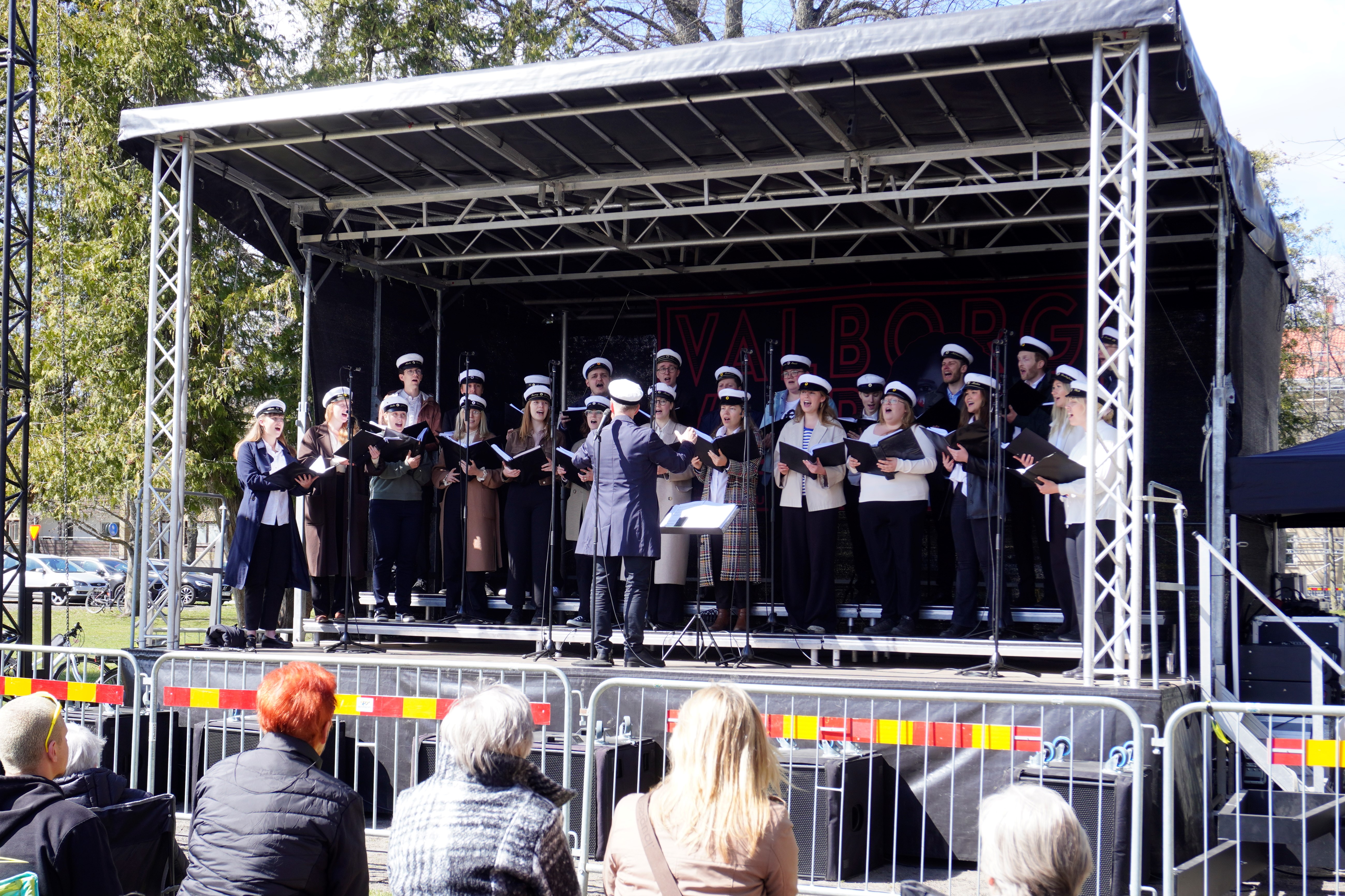 Jönköping Universitys akademiska kör JUVE leddes av dirigent Dan Boberg, som välkomnade våren och besökarna med traditionella låtar som Sköna maj, Studentsången och Våren kom en valborgsnatt. Anders Jonzon, kommunikationsdirektör på JU var konferencier och berättade om sin egen studietid, overall-traditioner och vårfirandet.
