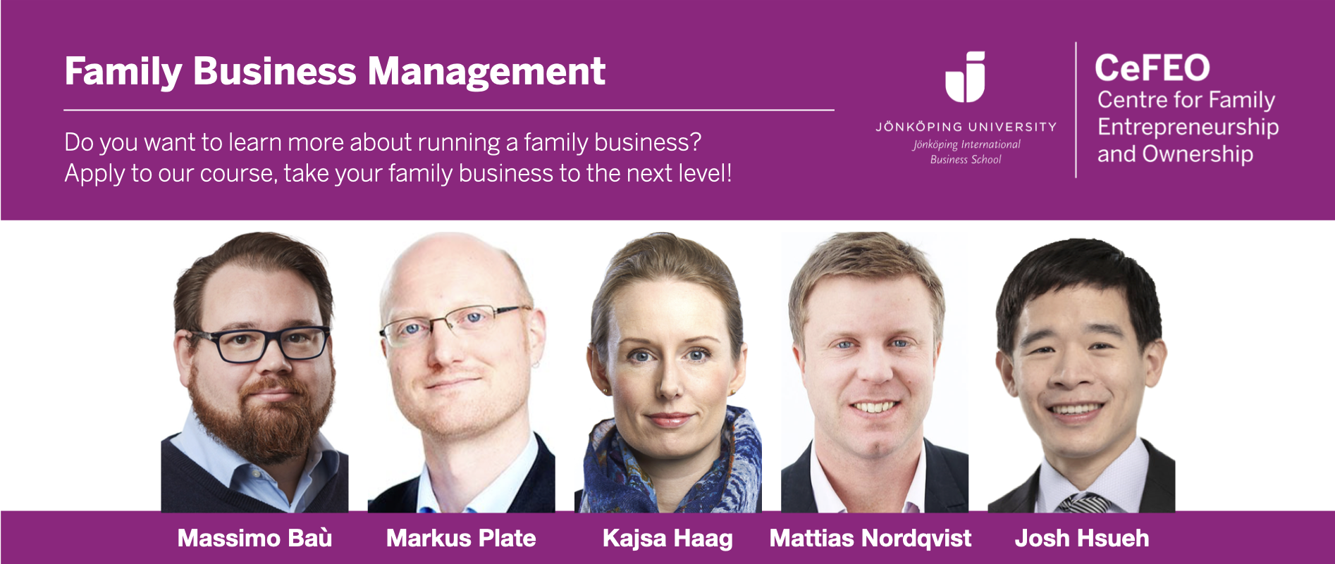 Denna kurs bygger på forskningsexpertis och praktisk relevans från Centre for Family Entrepreneurship and Ownership, och binder samman kärnkompetenserna hos JIBS-fakulteten inom familjeföretag och ägande. Deltagarna kommer att ha en unik möjlighet att tillämpa de mest relevanta teoretiska koncepten på exempel, fall och erfarenheter från familjeföretag. Kursen är skräddarsydd för företagsägare, yrkesverksamma och utövare som arbetar i eller med familjeföretag, samt för nästa generations medlemmar och efterträdare inom familjeföretag.
